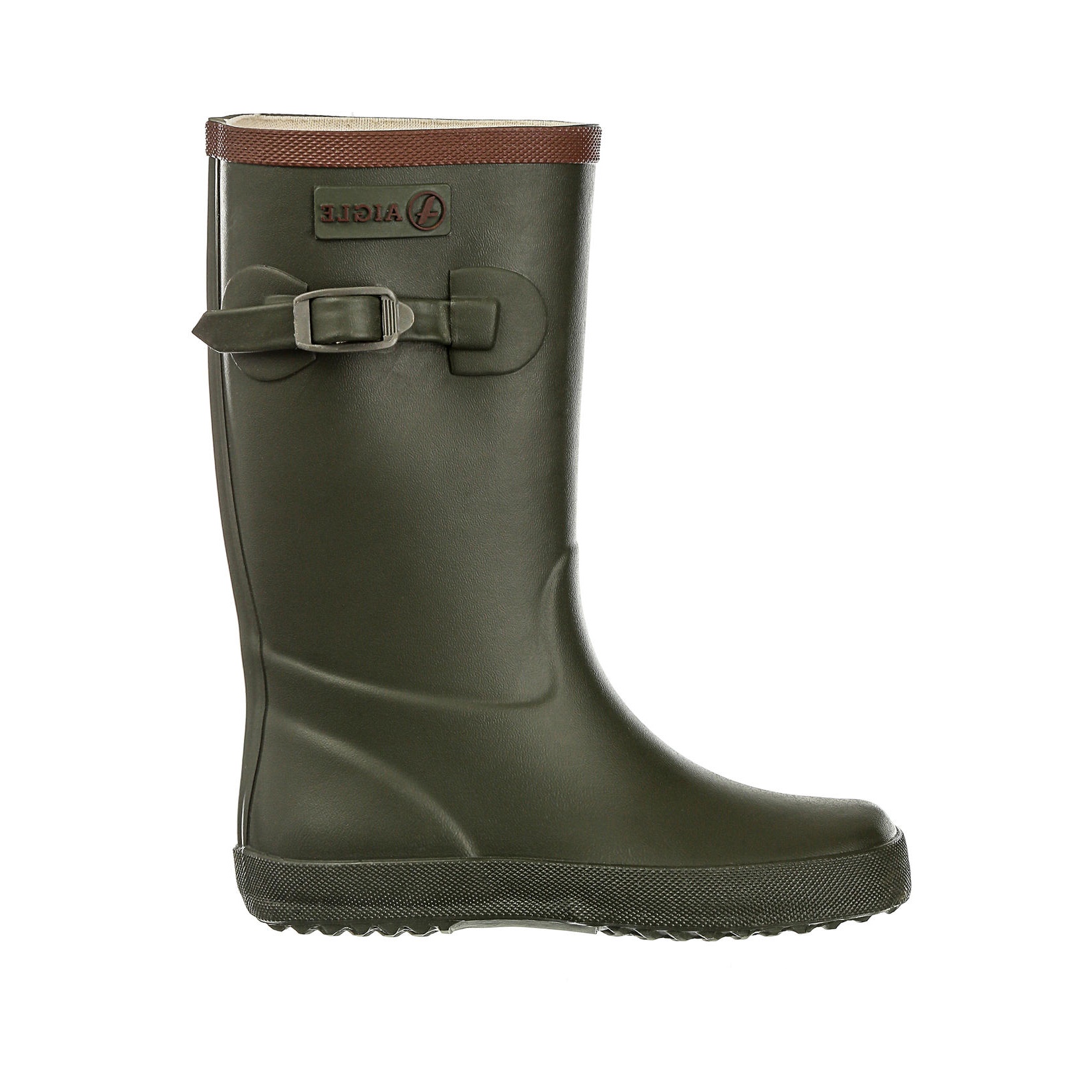 Den klassiske børnegummistøvle fra Aigle i brun og grøn kant foroven.
